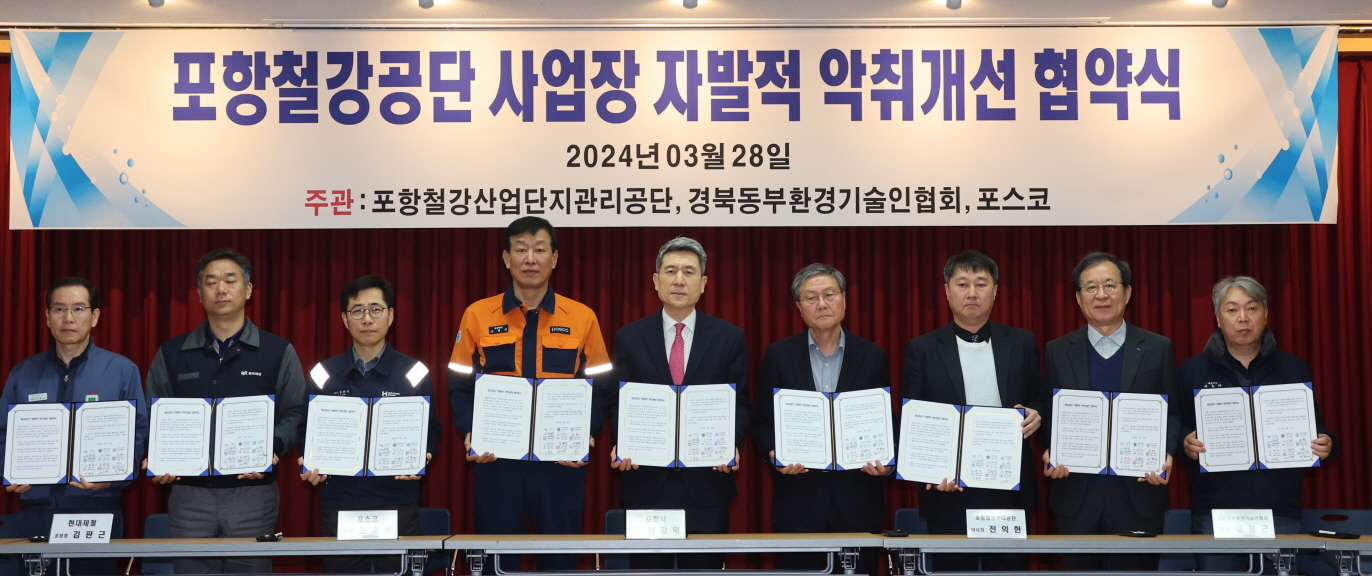 포항시는 28일 포항철강관리공단 대회의실에서 ‘철강공단 사업장 자발적 악취개선 협약식’을 맺고, 자발적 악취개선 노력에 민관이 함께 힘을 모으기로 했다.