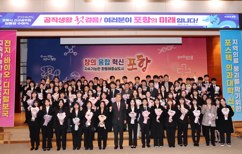 포항시는 12일 시청 대회의실에서 신규 공무원과 가족 등 150여 명이 참석한 가운데 임용장 수여식을 개최했다.