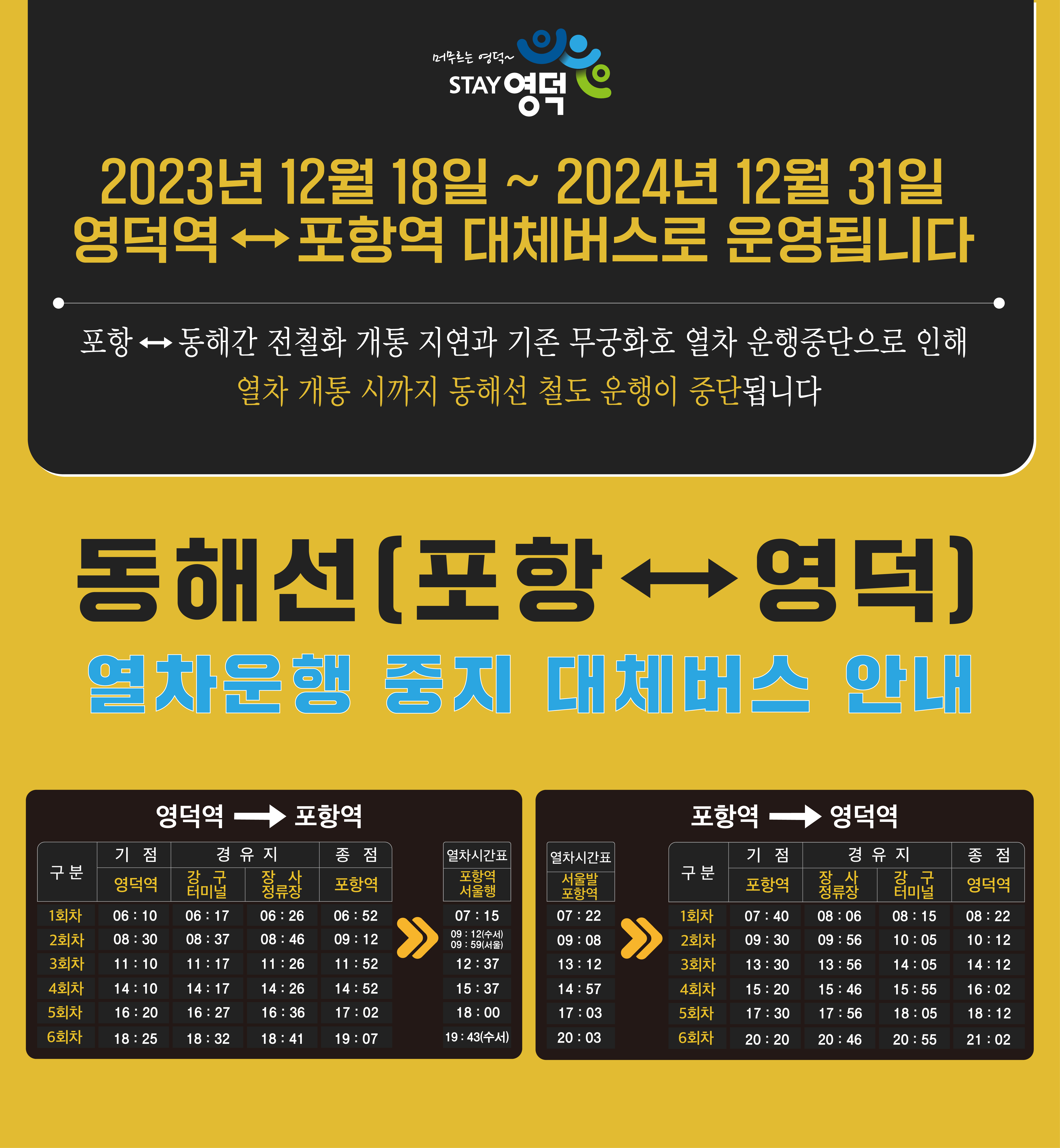 한국철도공사는 영덕~포항 간을 운행 중인 디젤동차(RDC)의 잔존수명평가 결과 안전상 연장 운행이 불가하다는 판단과 함께, 포항~삼척 간 전철화 사업 완료 시기가 올해 12월에서 내년 12월로 연기되면서 영덕~포항 간 열차 운행을 올 12월 18일부터 내년 12월 말까지 중단키로 하고 그 사실을 지난 10월 5일에 영덕군과 포항시 측에 통보한 바 있다.