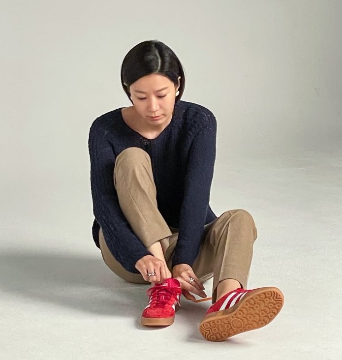 사진에서 전혜진은 스튜디오에서 블랙 니트와 베이지색 팬츠 차림으로 빨간 운동화를 신고 앉아있는 모습을 보여주었다. 어두운 무드 속에서도 전혜진은 무표정한 표정으로 신발을 바라보고 있다.