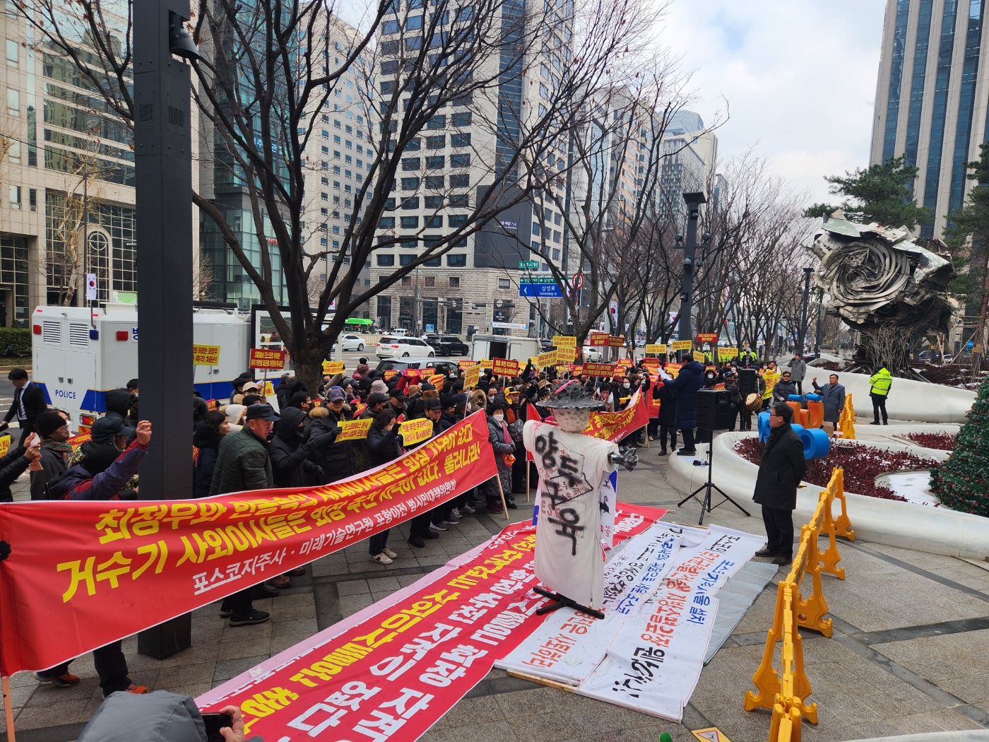 포스코 범대위 대책위원 등 포항시민 500여 명이 11일 서울 대치동 포스코센터에서 집회를 열고 있다.