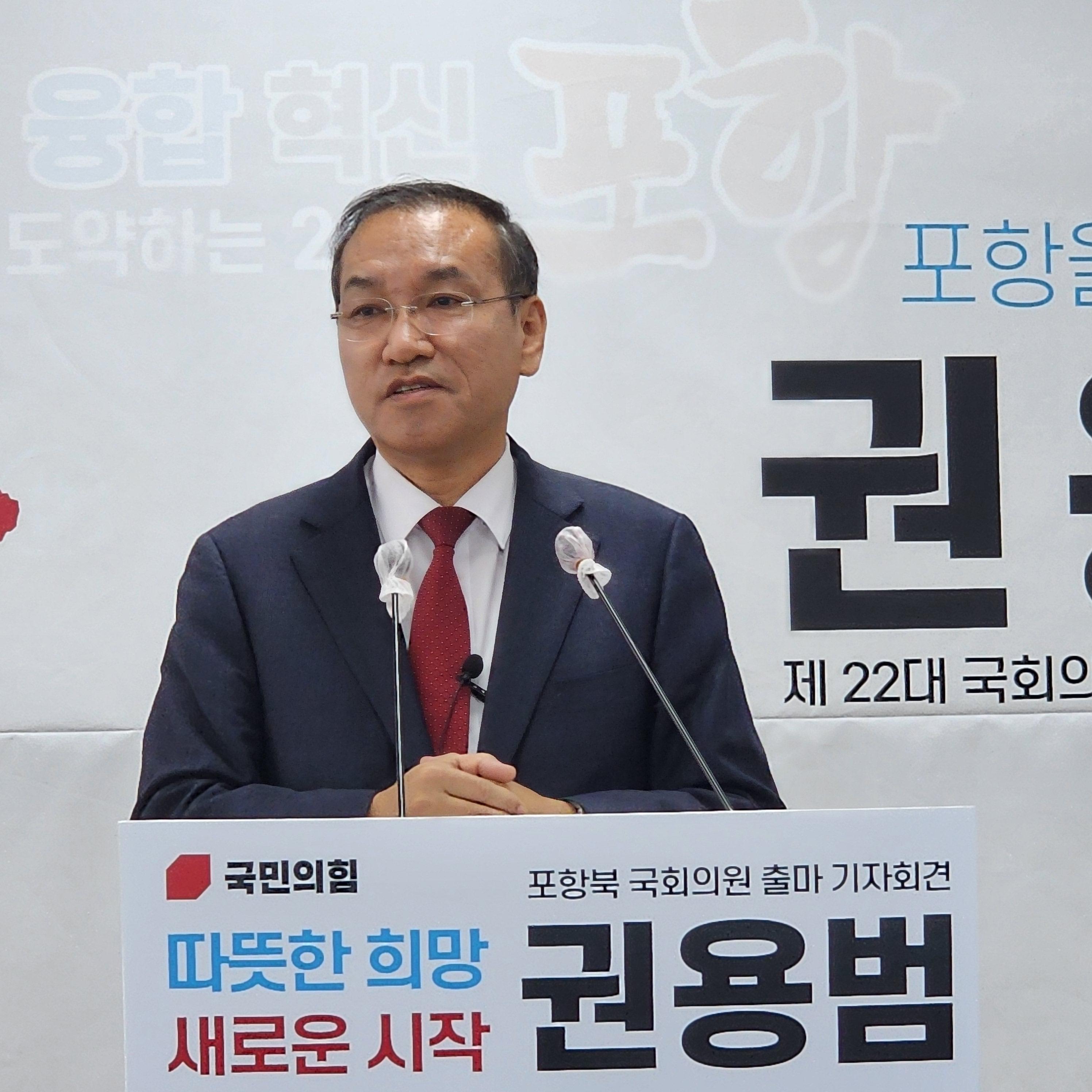 국민의힘 소속 권용범 전 대구미래대학 학장이 21일 오전 포항시청 브리핑룸에서 기자회견을 열고 “포항경제의 대혁신·대개편·대도약을 견인해 포항이 다시 대한민국의 4차 산업혁명시대를 주도하며, 글로벌 미래도시로 나아가는 ‘포항4.0시대’를 열어나가고자 내년 4월 포항 북구 국회의원 선거에 출마하게 되었다”고 밝혔다.